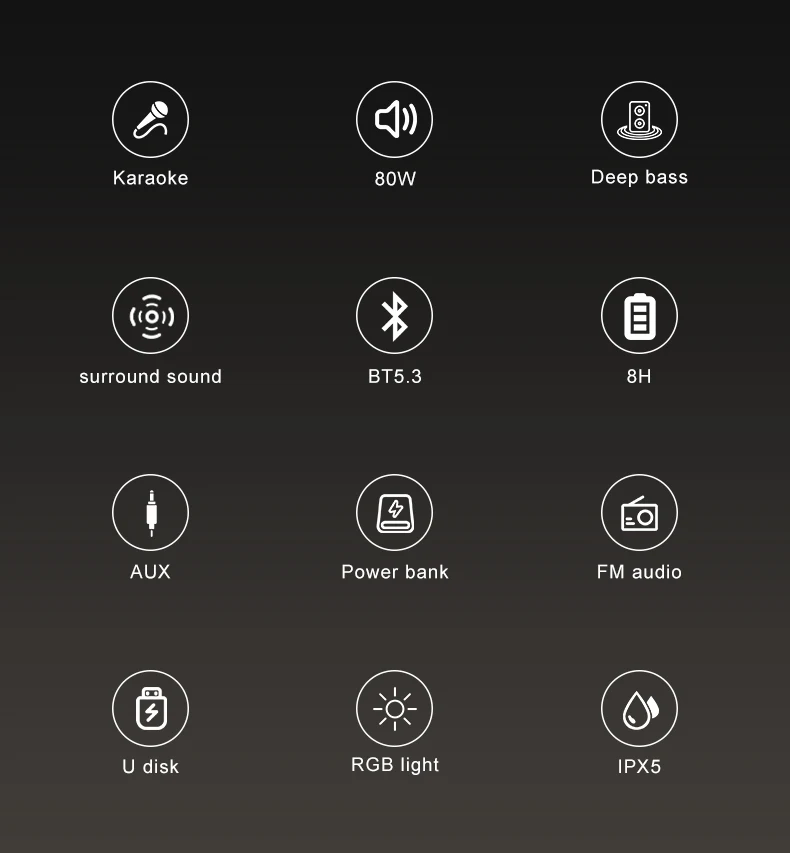 TF card/AUX/USB/FM/RGB Lights/TWS/K song